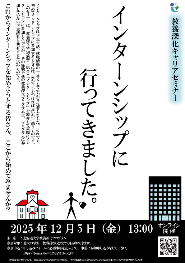 このセミナーは、教養深化特別演習(総合)「インターンシップ」を履修して実際にインターンシップに参加した学生が、その経験を他の教養深化プログラム生、プログラムに参加していない学生諸君と共有するためのものです。